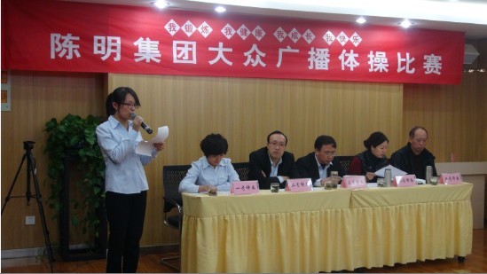 為了豐富員工業(yè)余生活,強化企業(yè)精神文明建設,切實提高員工的身體素質,陳明集團于2013年11月1日舉辦了以“我鍛煉、我健康、我成長、我快樂”為主題的第一屆廣播體操比賽。